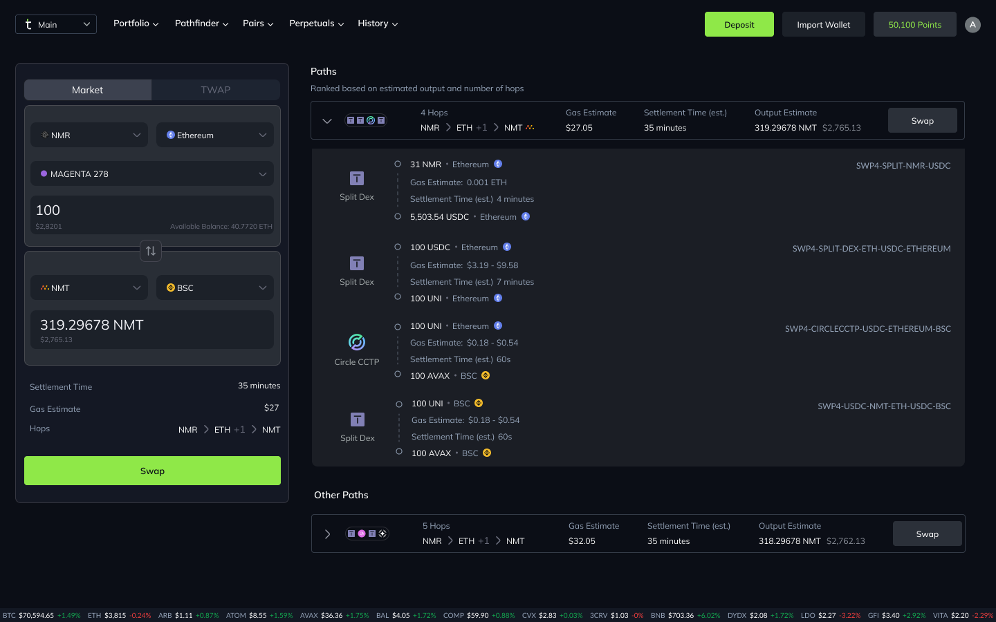 - Pathfinder: Best Path Execution Pathfinder, identifies and executes the best path for trades from any token on any chain to any other token on any chain supported by Terrace. This feature streamlines complex transactions and maximizes efficiency as you are able to get better pricing routes and deeper liquidity.