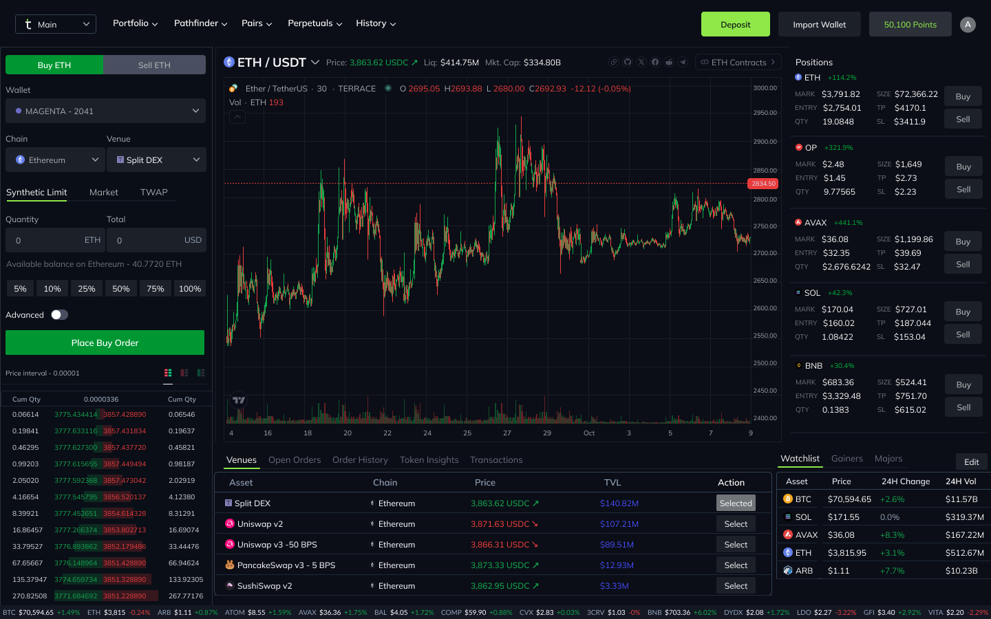 - Advanced Order Types and Smart Order Routing: Terrace supports sophisticated trading strategies with tools such as TWAP (Time-Weighted Average Price), limit, and icebergs orders and offers full L2 order books on all venues (DEX or CEX). Smart order routing ensures that every trade is executed at the best possible price, leveraging liquidity from multiple venues.